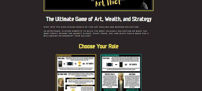 Arbitrage- aim to finish the game with the highest net worth by combining money, assets, and awards! You can succeed by playing as a museum or as the auction house.